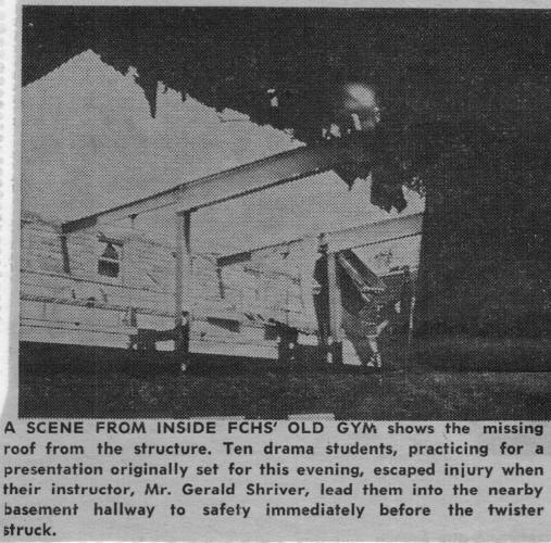 The twister hit Freeburg Community High School and ripped off the roof of the old gymnasium, damaged the roof of the administration building, shattered a wall on the west side and broke numerous windows. Superintendent Frank Nation called off classes for the day.